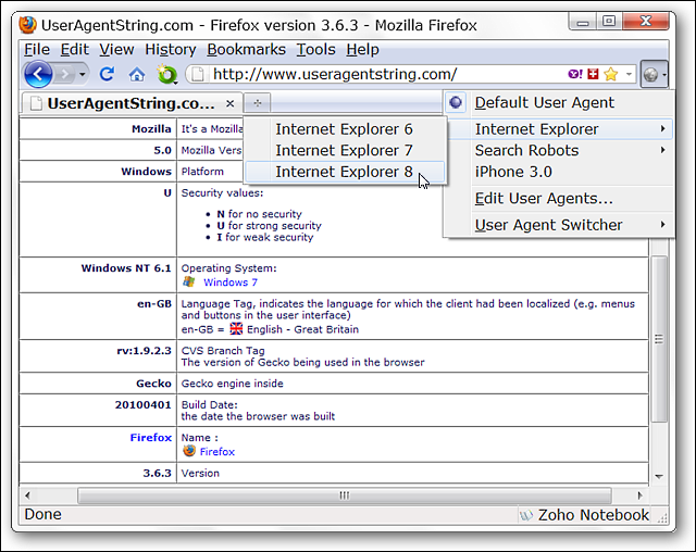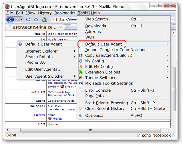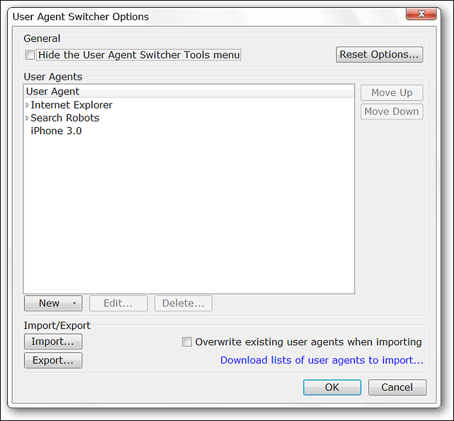 Die User Agent Switcher-Erweiterung bietet eine schnelle und einfache Möglichkeit, die User Agent-Zeichenfolge für Websites zu ändern, die nicht kooperativ sind. Wenn Sie zusätzliche Zeichenfolgen für Benutzeragenten hinzufügen möchten, besuchen Sie diese Webseite (verfügbar im XML-Dateiformat).