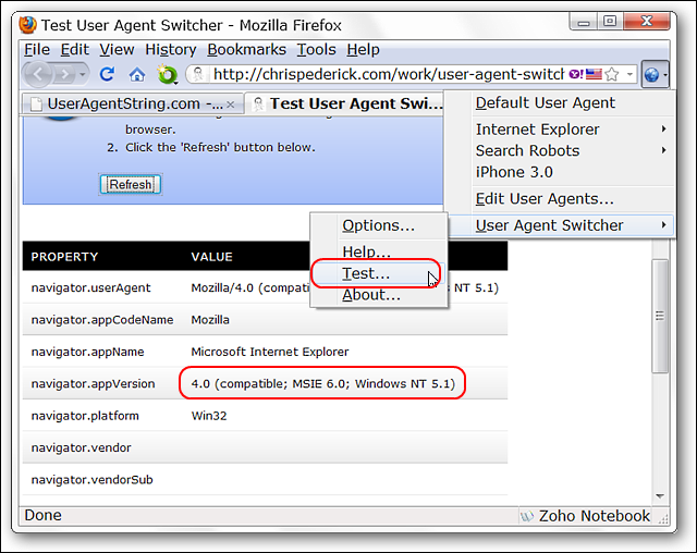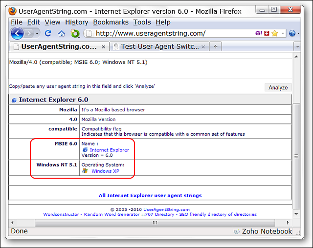 Um die Sache interessant zu halten, haben wir die Benutzeragentenzeichenfolge für Internet Explorer 6 festgelegt. Hier werden positive Tests für IE 6 und Windows XP durchgeführt.