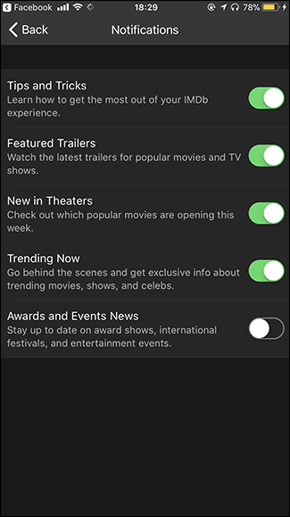 Wenn Sie schon dabei sind, möchten Sie vielleicht auch alle anderen Benachrichtigungen deaktivieren. Ich bin mir nicht sicher, ob jemand Push-Benachrichtigungen zur Verwendung der IMBD-App möchte.