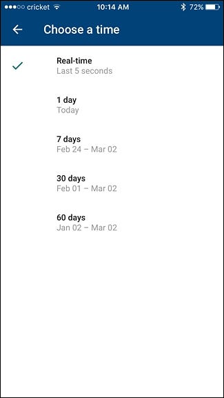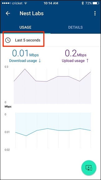 Standardmäßig wird die Datennutzung des Geräts in den letzten fünf Sekunden angezeigt. Sie können jedoch einen breiteren Verlauf anzeigen, indem Sie oben auf „Letzte 5 Sekunden“ tippen.