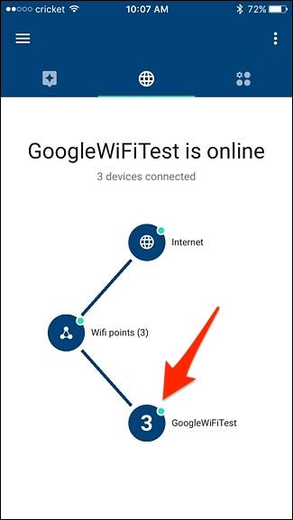 Tippen Sie von dort aus auf den Kreis unten neben dem Namen Ihres Google WiFi-Netzwerks.